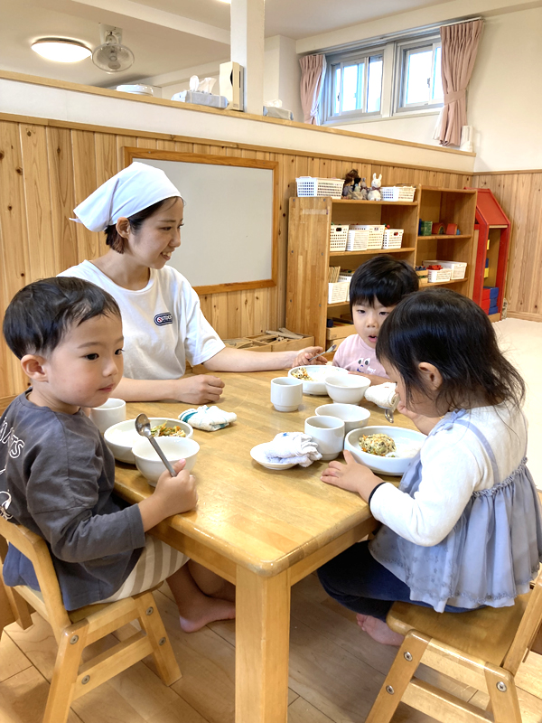 「自分で」という自立したい気持ちを伸ばしながら丁寧に食習慣の基礎を作っていくために、0・1歳児と同じように担当制を取り入れ、いつも同じ手順で決まった大人が進めています。